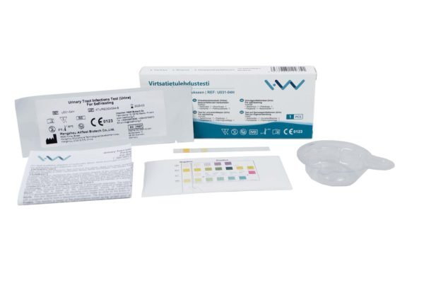 The Urinary Tract Infections Test (Urine) is firm plastic strips onto which several separate reagent areas are affixed. The test is for the qualitative detection of the following analytes in urine: Leukocytes, Blood, Nitrite and Protein. The Urinary Tract Infections Test (Urine) is for single use in self-testing.